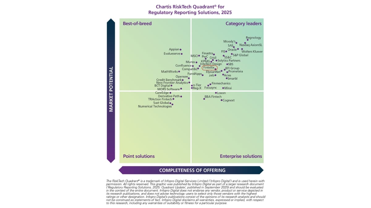 ‘Fintellix’s Category Leader placing in our 2025 Regulatory Reporting quadrant reflects a global expansion strategy and a growing presence in India, APAC and the Middle East, combined with a data-driven platform that supports the full regulatory reporting lifecycle,’ said Anish Shah, Research Director at Chartis. ‘Moreover, the Fintellix solution enables timely, cost-efficient and accurate compliance for financial institutions, by supporting jurisdiction-specific regulations and associated reporting requirements.’