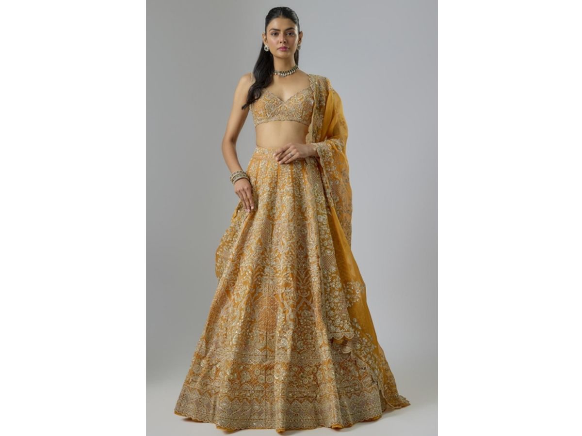 Anushree Reddy’s designs are the embodiment of soft luxury. Her lehengas often feature delicate florals, soothing pastels, and embroidery that feels as light as air. There is a distinctly bridal tone to her work, but it never crosses into garish territory. Instead, it feels like a whispered poem stitched into fabric.